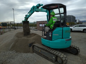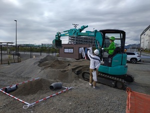 今回は、当社の作業所で体験をしてもらいました。当社作業所では重機および測量の体験をしてもらいました。